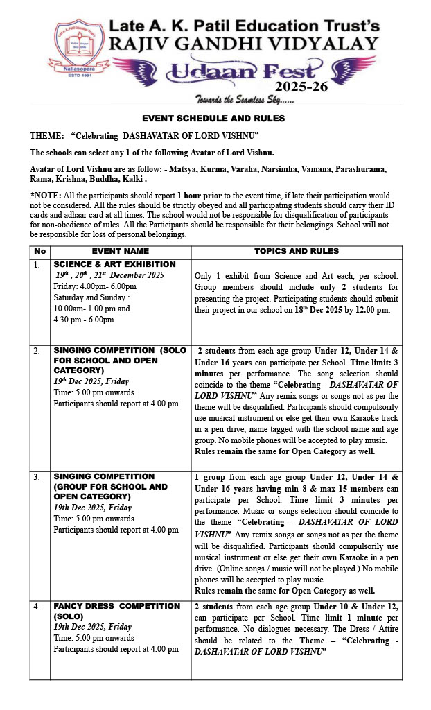 ‘UDAAN FEST 2025-26 Towards the seamless sky…..’ is a 3 day interschool event including many co-curricular competitions which is being organized in November/ December every year. The motto of this event is to give wings to the students to fly high, Towards the seamless sky…. by exploring their talents, bringing confidence in them to face challenges, bringing out their creativity, to become one nation irrespective of the caste creed and culture they have and become successful and achieve their dreams. It will be the 10th consecutive year that LATE A. K. PATIL EDUCATION TRUST’S RAJIV GANDHI VIDYALAY is going to organize ‘UDAAN FEST 2025-26’ with immense enthusiasm from 19th to 21st of December 2025.